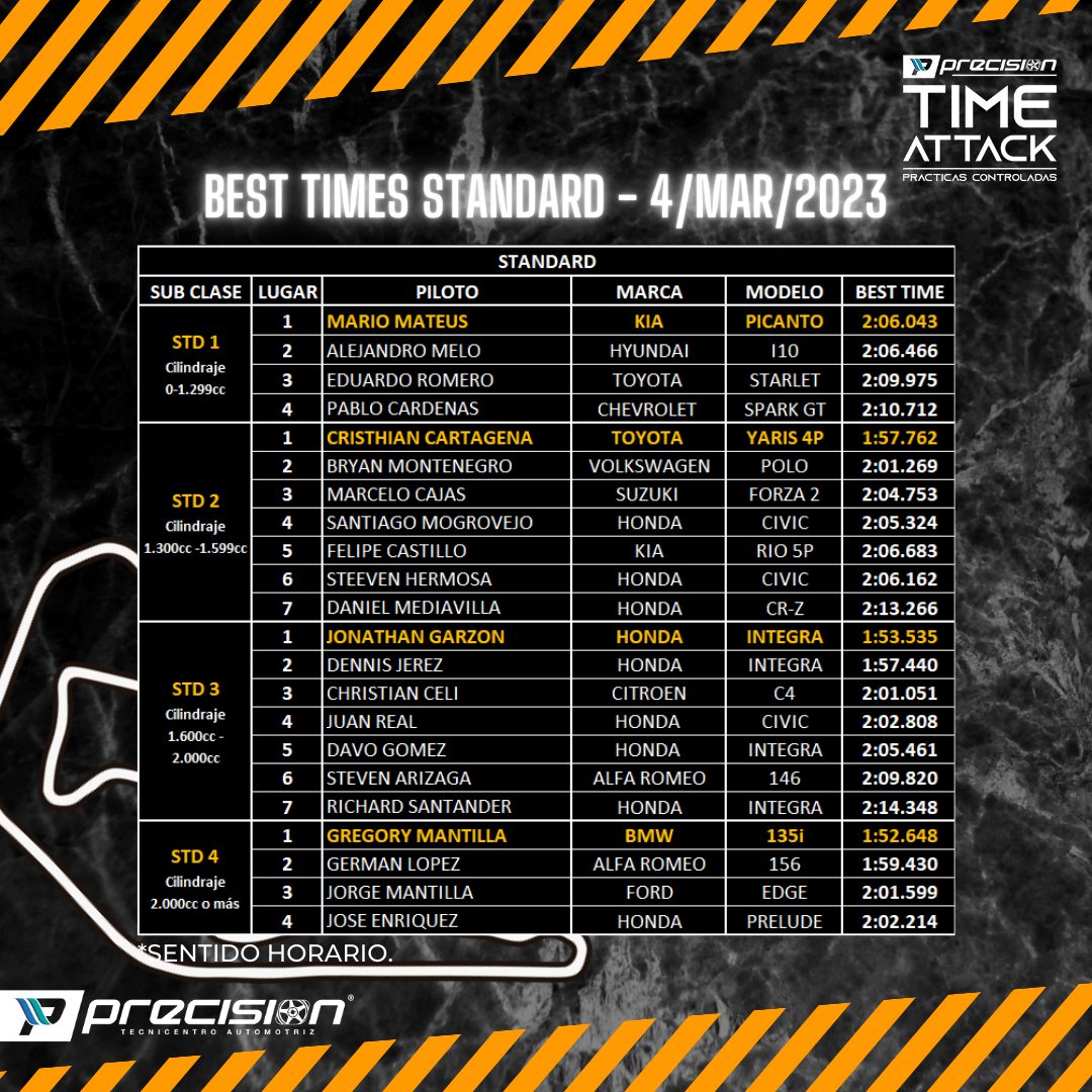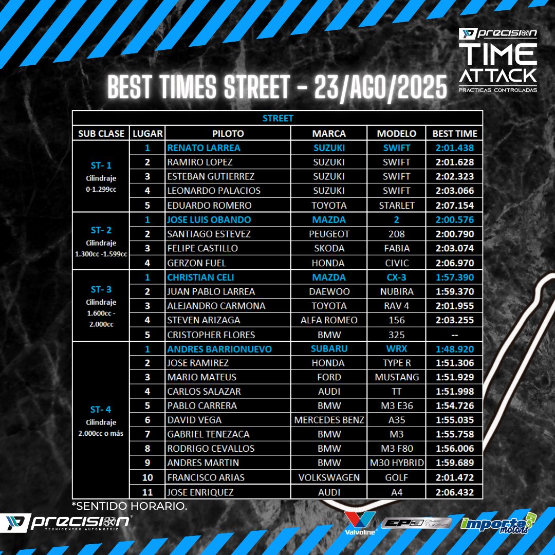 GALERÍA DE IMÁGENES Whatsapp RÉCORD PRECISION TIME ATTACK 1:37.856 Piloto: luis avila mitsubishi lancer evo x SENTIDO: HORARIO REGISTRO DE TIEMPOS PRECISION TIME ATTACK 23 AGOSTO 2025 BEST TIMES POR CATEGORÍA 23 AGOSTO 2025 BEST TIMES POR DIVISIÓN TOTAL SENTIDO: HORARIO S: SUPER 1:39.655 S1: MATHEO MONROY BMW M4 Competition SENTIDO: HORARIO TK: RACE 1:37.856 TK-4: LUIS AVILA MITSUBISHI LANCER EVO X SENTIDO: HORARIO ST: STREET 1:51.306 TK-4: JOSE RAMIREZ HONDA CIVIC TYPE R SENTIDO: HORARIO BEST TIMES POR CATEGORÍA TOTAL SENTIDO: HORARIO RÉCORD PRECISION TIME ATTACK ANTI HORARIO 1:50.224 Piloto: CARLOS FLORES VOLKSWAGEN BORA 2.0 TURBO SENTIDO: ANTI HORARIo(2 cHICANES) ST: STREET 1:55.346 TK-3: JONATHAN GARZÓN HONDA INTEGRA SENTIDO: ANTI HORARIO (2 CHICANES) TK: RACE 1:52.761 TK-3: OMAR SARANGO HONDA INTEGRA SENTIDO: ANTI HORARIO (2 CHICANES) S: SUPER 1:50.224 S-2: CARLOS FLORES VOLKSWAGEN BORA 2.0T SENTIDO: ANTI HORARIO (2 CHICANES) BEST TIMES POR CATEGORÍA TOTAL SENTIDO ANTI HORARIO REGISTRO DE TIEMPOS PRECISION TIME ATTACK 04 MARZO 2023 SI TODO ESTA BAJO CONTROL, SIGNIFICA QUE NOVAS LO SUFICIENTEMENTE RÁPIDO. Mario Andretti IBARRA – ECUADOR LUN-VIE 8H00 a 18H00 SAB 9H00 a 13H00 +593-967847423 info@precision-autos.com